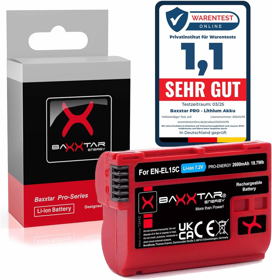 - Baxxtar Pro EN-EL15c: Die neueste Entwickung aus unserem Hause, bringt Sie auf den neuesten Stand der EN-EL15 Reihe. Ein Kraftpaket mit nochmals gesteigerter Leistung.