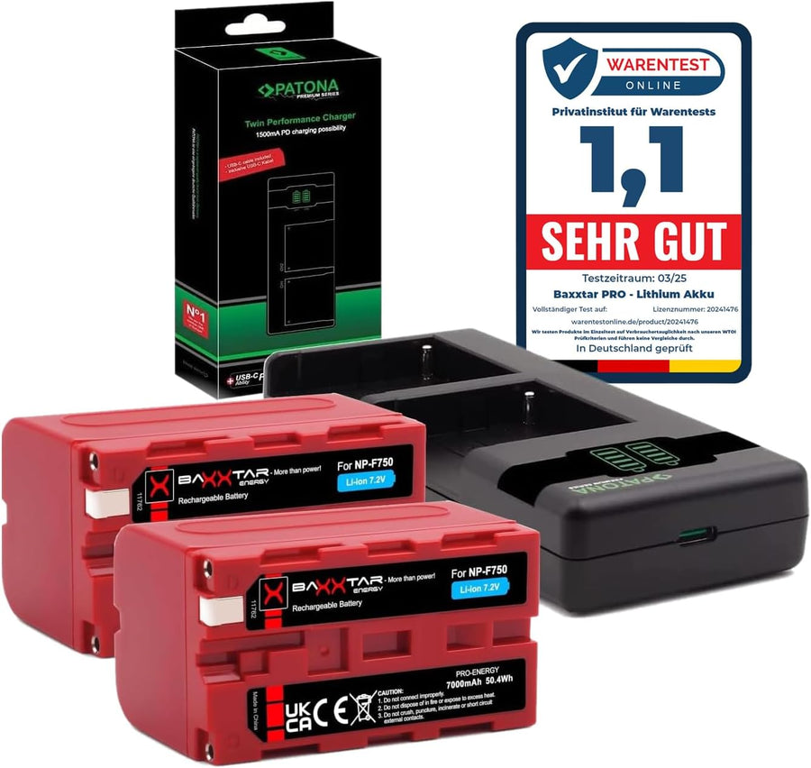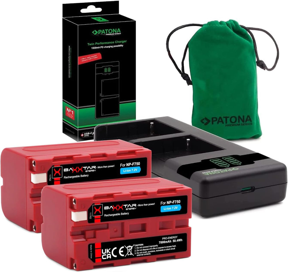- LIEFERUMFANG: 2x Baxxtar NP-F750 Akku / 1x PATONA PD Performance Ladegerät 161951 / 1x USB-C auf USB-C Kabel / Transportsäckchen / Bedienungsanleitung