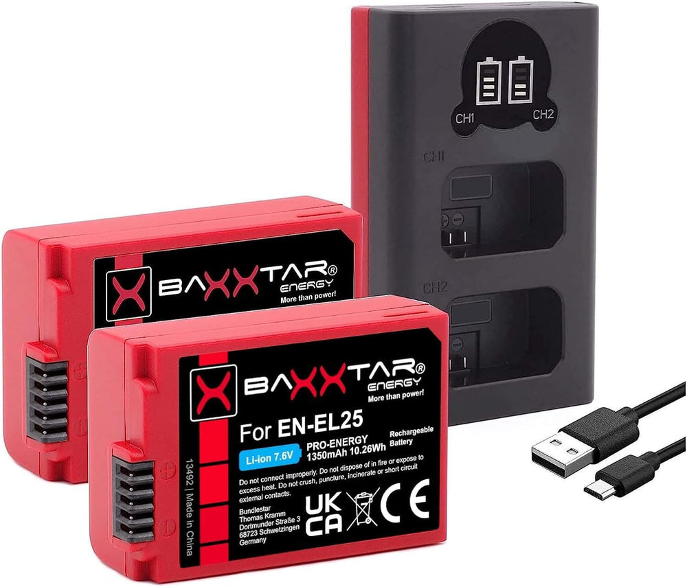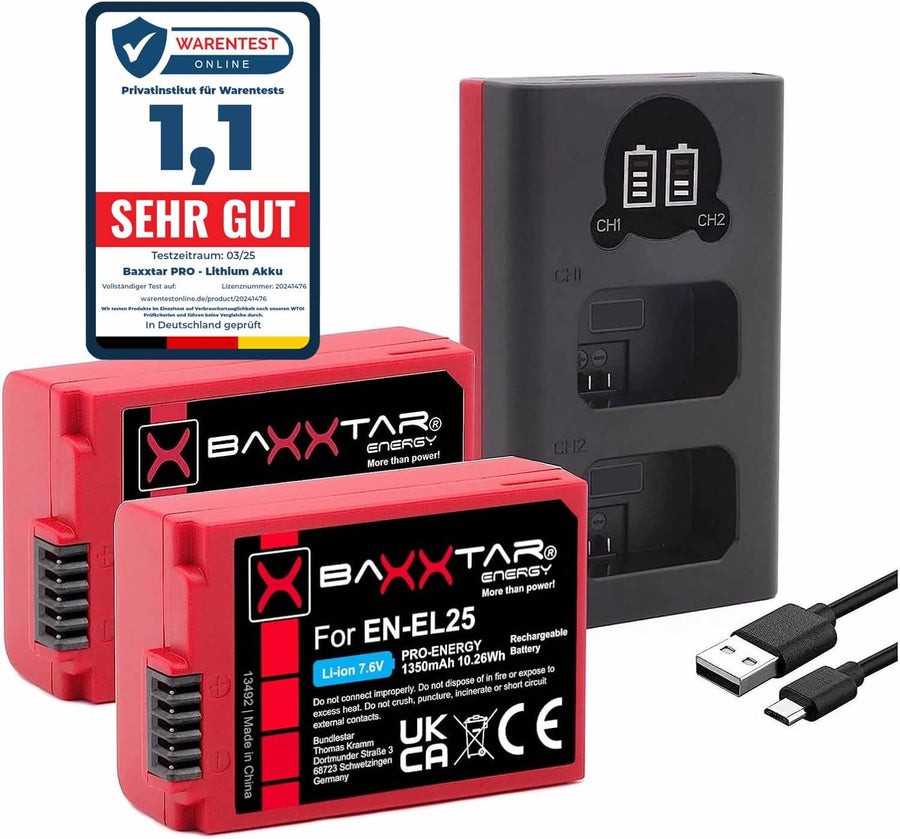 - BAXXTAR PRO SET: Ersatz für Akku Nikon EN-EL25 (2x) mit mini Ladegerät (USB, Dual). Diese Neuentwicklung ist ein echtes Kraftpaket und wir freuen uns sehr, Ihnen diesen Akku präsentieren zu können.