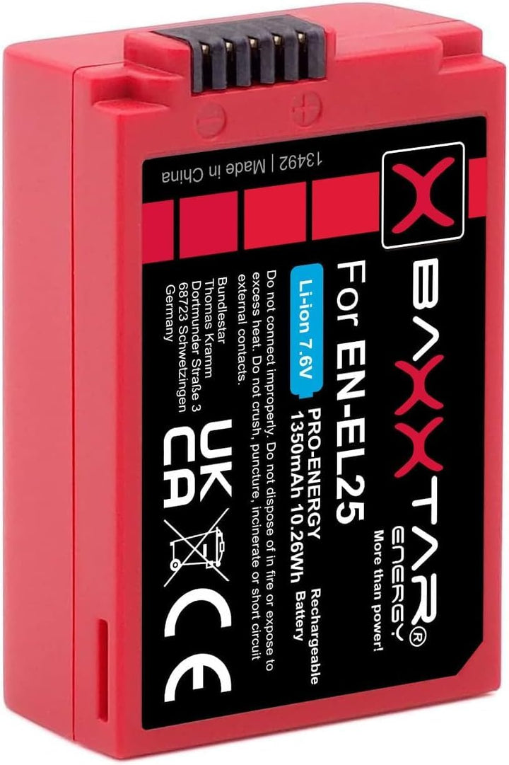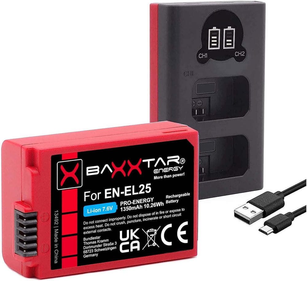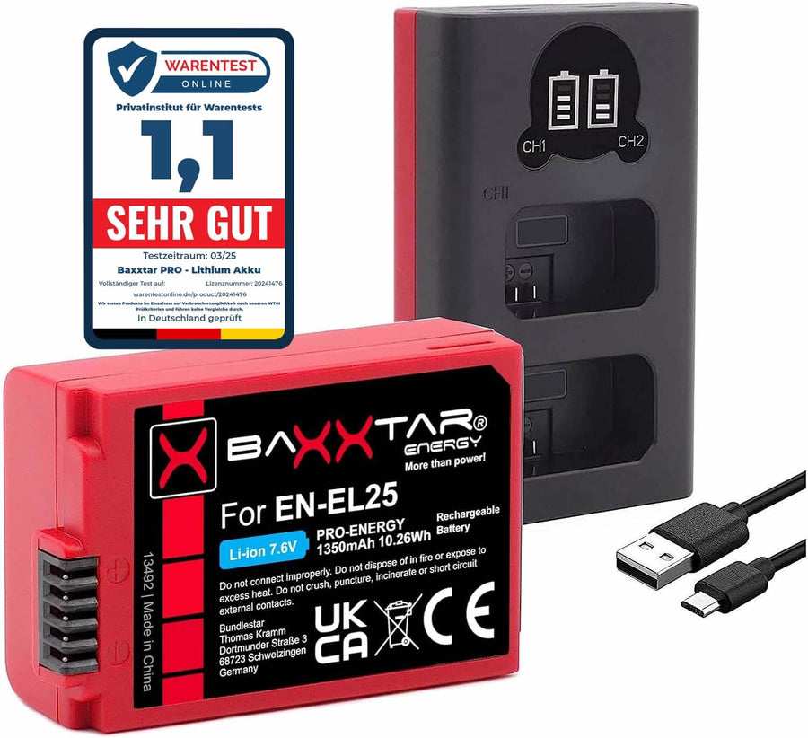 - BAXXTAR PRO SET: Ersatz für Akku Nikon EN-EL25 mit mini Ladegerät (USB, Dual). Diese Neuentwicklung ist ein echtes Kraftpaket und wir freuen uns sehr, Ihnen diesen Akku präsentieren zu können.