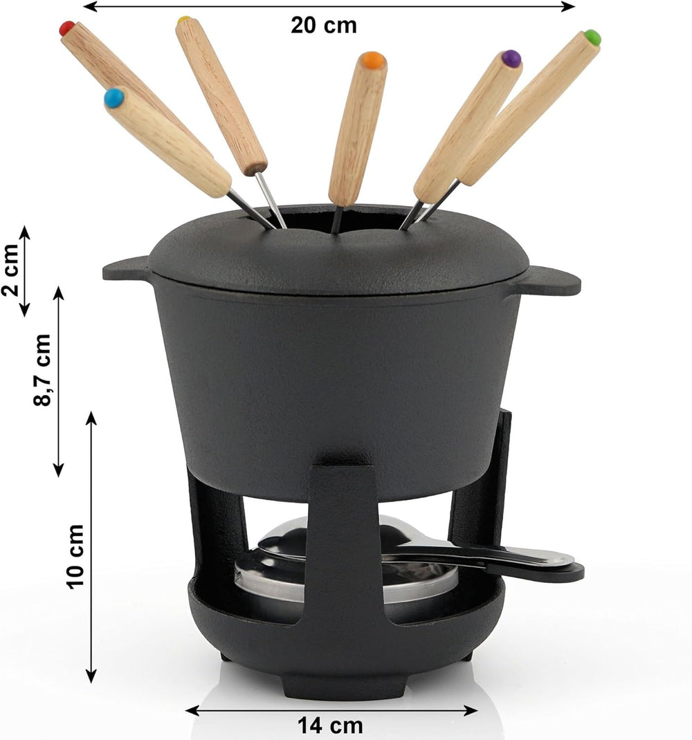 - DETAILS | FONDUETOPF: Gusseisen - 1 L - Innenmass Ø 14,5 cm - Aussenmass 20 x 15,5 x 8,7 cm - Gewicht 1,2 kg | RECHAUD: Gusseisen - schwarz - Aussenmass Ø 14 x 10 cm - Gewicht 700 gr | FONDUEGABEL: 6 Stück - 24 cm - mit Holzgriff - 6 Farben | BRENNER: 4-teilig