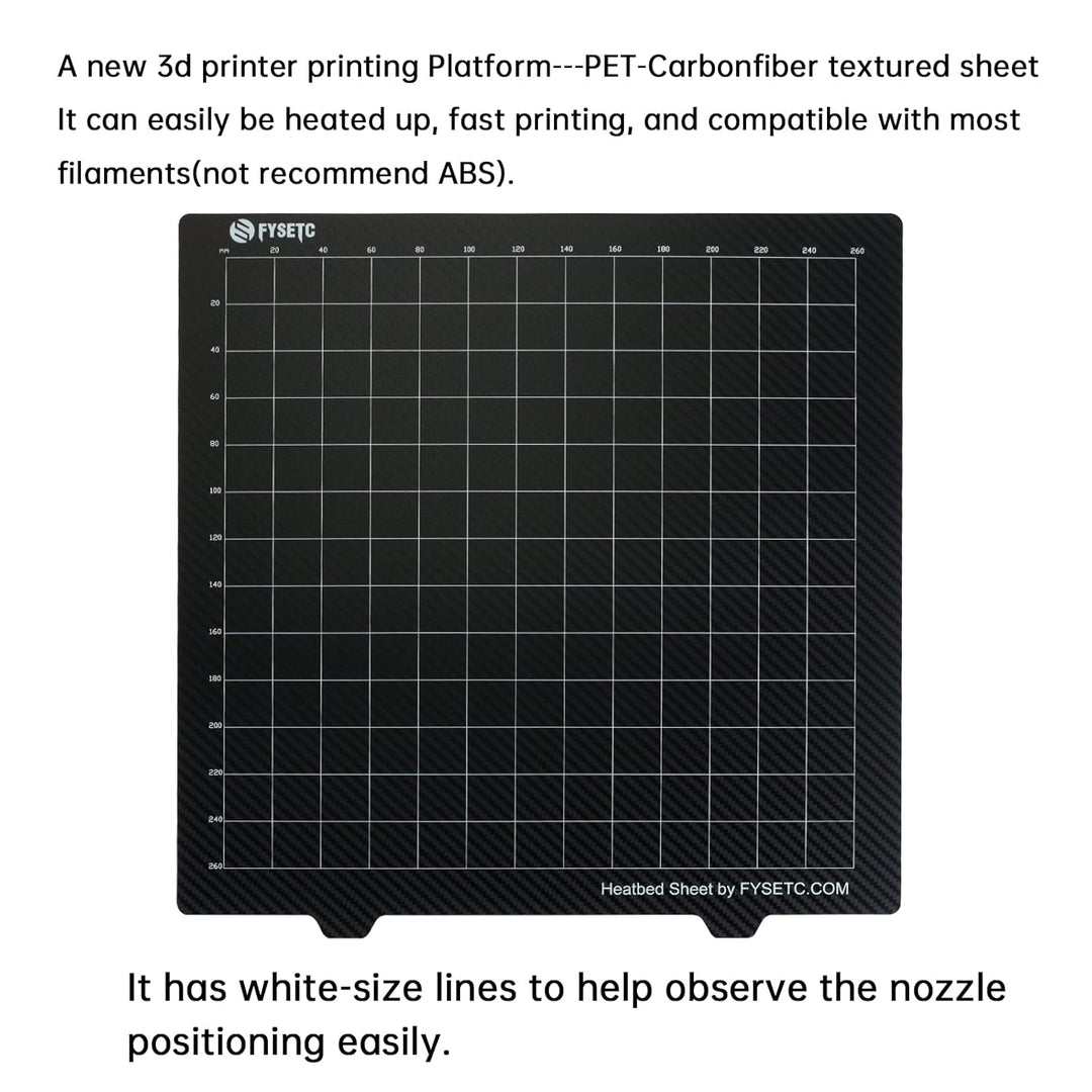 - Material: Stahl+PEI+PET, Die Oberfläche der PET-Kohlefasertextur kann hohen Temperaturen von 100℃ standhalten, und die PEI-Pulverseite ist bis zu 190 °C. Aber lassen Sie die beheizte Düse nicht die Oberfläche berühren, oder es wird die Oberfläche