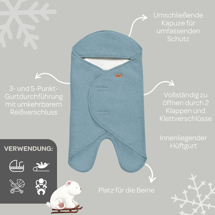 - PRAKTISCHER VERSCHLUSS: Ärmellose Wickeldecke mit vollständiger Öffnung durch 2 Klappen und Klettverschlüsse, die eine einfache und schnelle Benutzung ermöglichen.