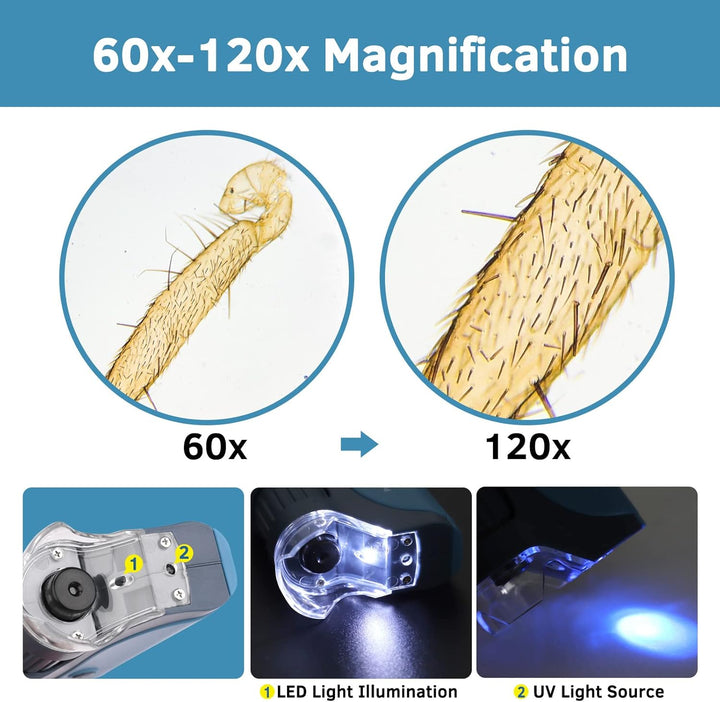 - 👸🤴🎁✨🎄Das 60x-120x Taschenmikroskop ist ein fantastisches, tragbares Gerät, mit dem Kinder und Schüler spannende mikroskopische Abenteuer erleben können. Mit seinen LED-beleuchteten Zoom-Funktionen, den mitgelieferten vorbereiteten