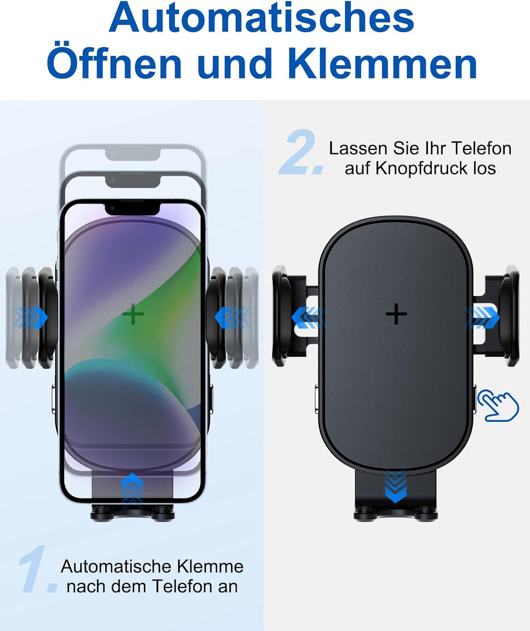 - ⚡【Automatischer Klemmung & Einhandbedienung】Mit automatischer elektromagnetischer Induktion können sich die Klemmarme automatisch öffnen und schliessen. Wenn der Kfz Handyhalterung mit Ladefunktion Ihr Telefon erkennt, schliesst es sich