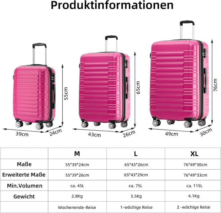 - Masse- und Gewichtsangaben (inkl. Griffe und Rollen): Grösse XL: Masse:76x49x30 cm; Gewicht: 4,1 kg; Min.Volumen: ca. 115 L Grösse L: Masse:65x43x26 cm; Gewicht:3,5 kg; Min.Volumen: ca. 75 L Grösse M: Masse:55x39x24 cm; Gewicht:2,8 kg; Min.Volumen: