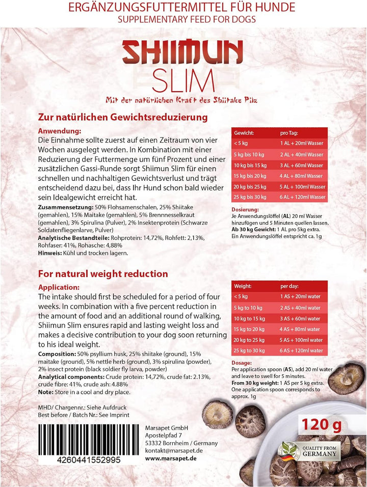 • Die perfekt abgestimmte Zusammensetzung aus sorgfältig ausgewählten natürlichen Inhaltsstoffen macht Shiimun Slim zum idealen Begleiter der Diät Ihres Hundes