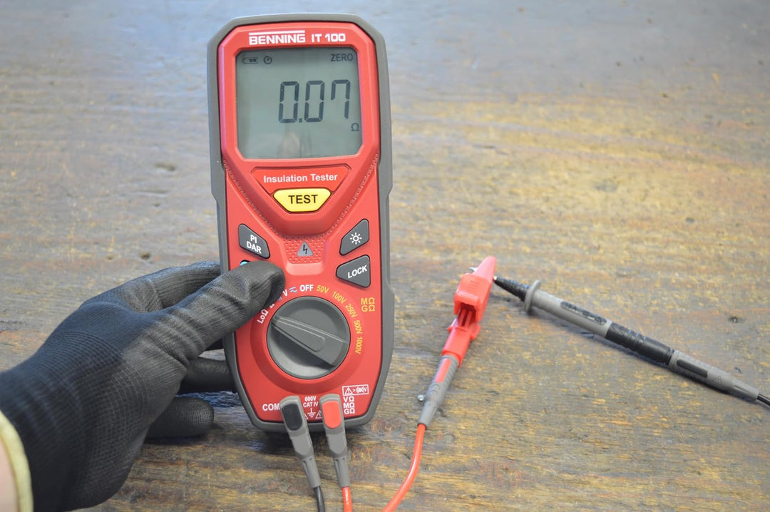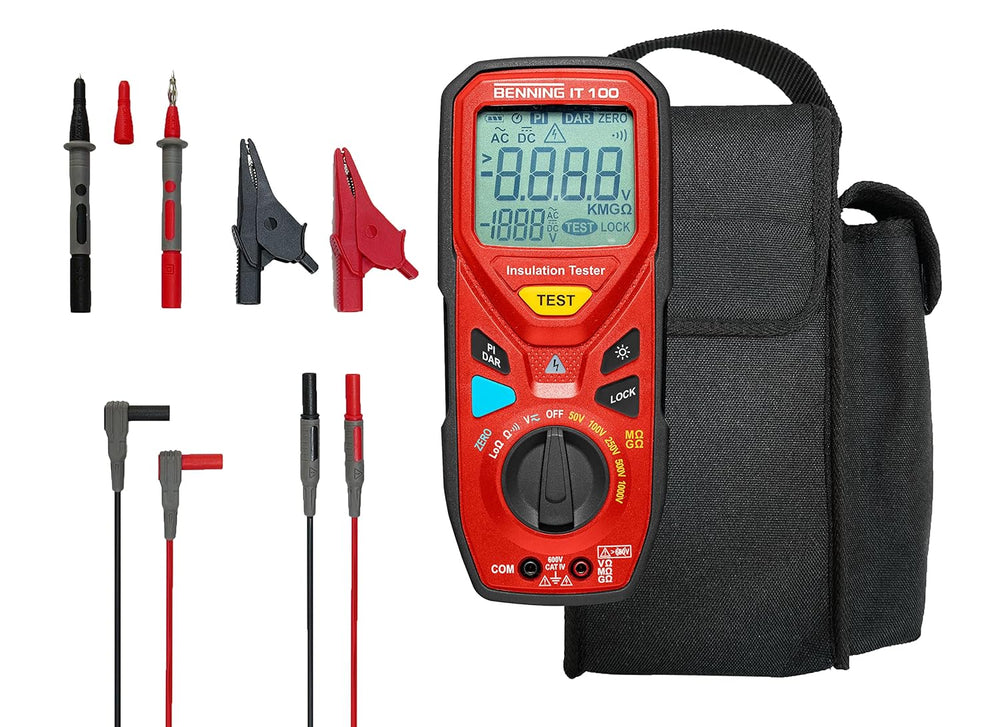 - Nullabgleich der Messleitungen bis 2 Ω, Lock-Funktion für kontinuierliche Isolations- und Niederohmmessung