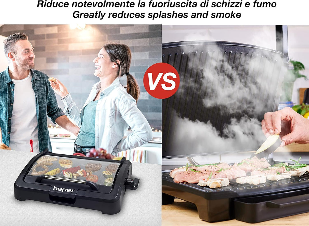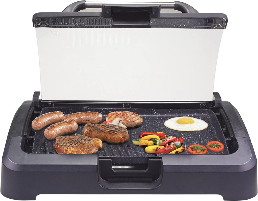- DUAL COOKING ZONES: Die Oberfläche des Grills hat einen glatten Bereich für Gemüse und Meeresfrüchte. Während die linke Seite des Elektrogrills für Fleisch geeignet ist, hat sie spezielle Rillen, durch die überschüssiges Fett abfliessen kann.
