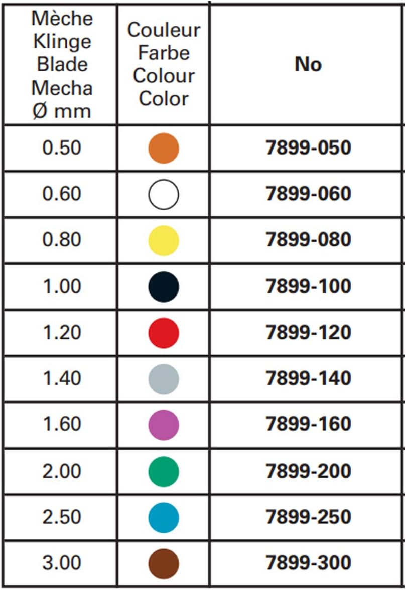 - Klinge: Aus gehärtetem Edelstahl (54 HRC); Durchmesser: 0,50 mm.