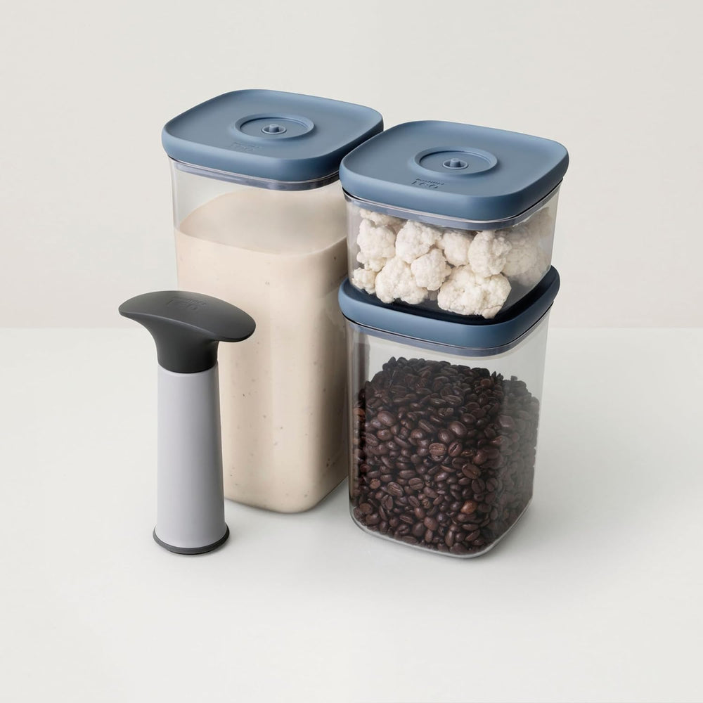 - Schont die Lebensmittel, indem die gesamte Luft entfernt wird, die normalerweise zu einem Verlust von Frische und Verfärbungen führen kann. Jeder Behälter hat ein Silikonventil und eine luftdichte Dichtung.