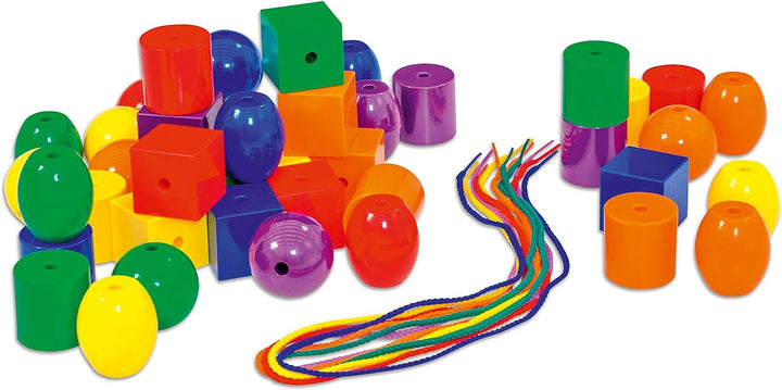 • FÖRDERT GESCHICKLICHKEIT UND GEDULD: Das Auffädeln der verschiedenförmiger XXL-Perlen auf die bunten Fädelschnüre fördert die Geschicklichkeit und die Geduld der Kleinkinder.