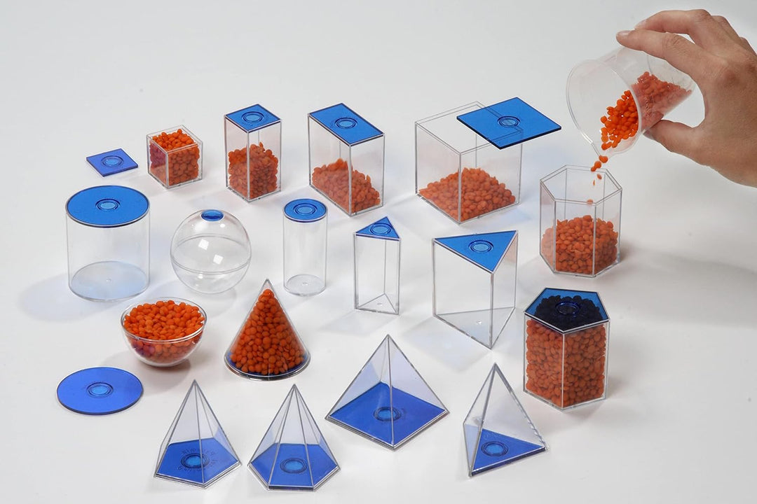 - 17 GEOMETRISCHE KÖRPER IM MATHE-SET: Zylinder, Pyramide, Kegel, Prisma, Quader, Würfel und Kugel im Füllkörper-Set. Das macht das Geometrie-Set zum wichtigen Lehrmittel im Mathematik-Unterricht.