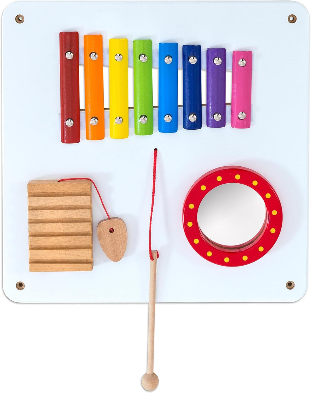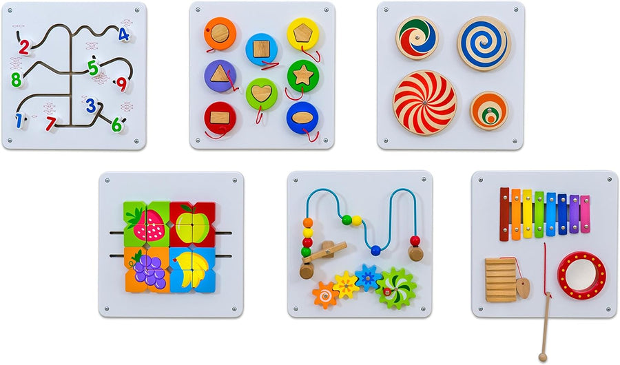 - SET ZUR SINNESWAHRNEHMUNG: Im Lieferumfang des Motorik-Spielzeuges sind 6 unterschiedliche Kinder-Wandspiele enthalten. Die Bereiche Form, Farbe, Klang, Ton, Zahlen, Drehen und Stecken werden abgedeckt.