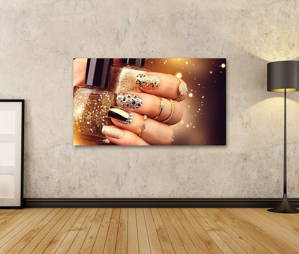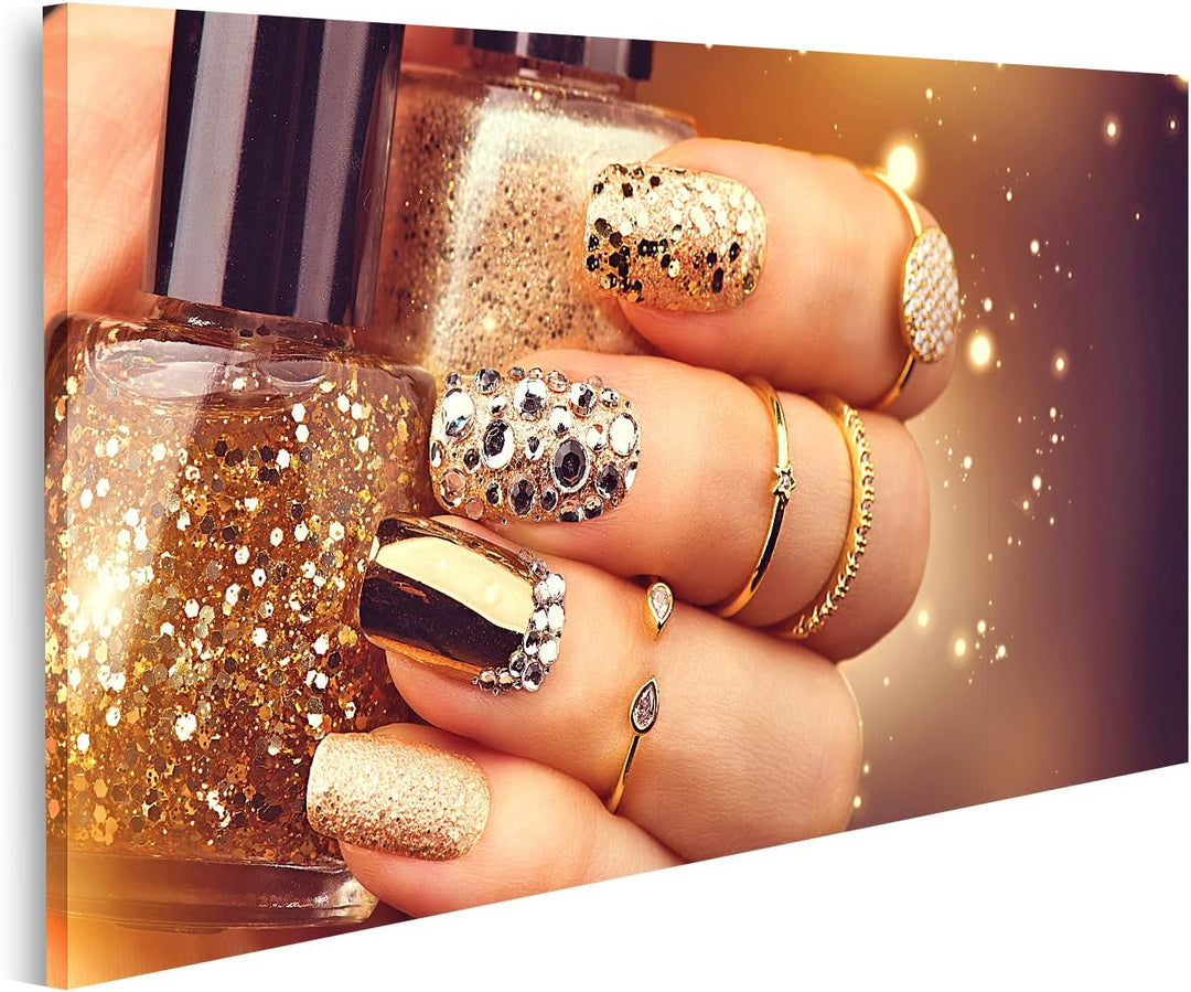 Bild auf Leinwand Goldene Maniküre Mit Edelsteinen Und Funkelt Eine Flasche Nagellack Trendige Acces