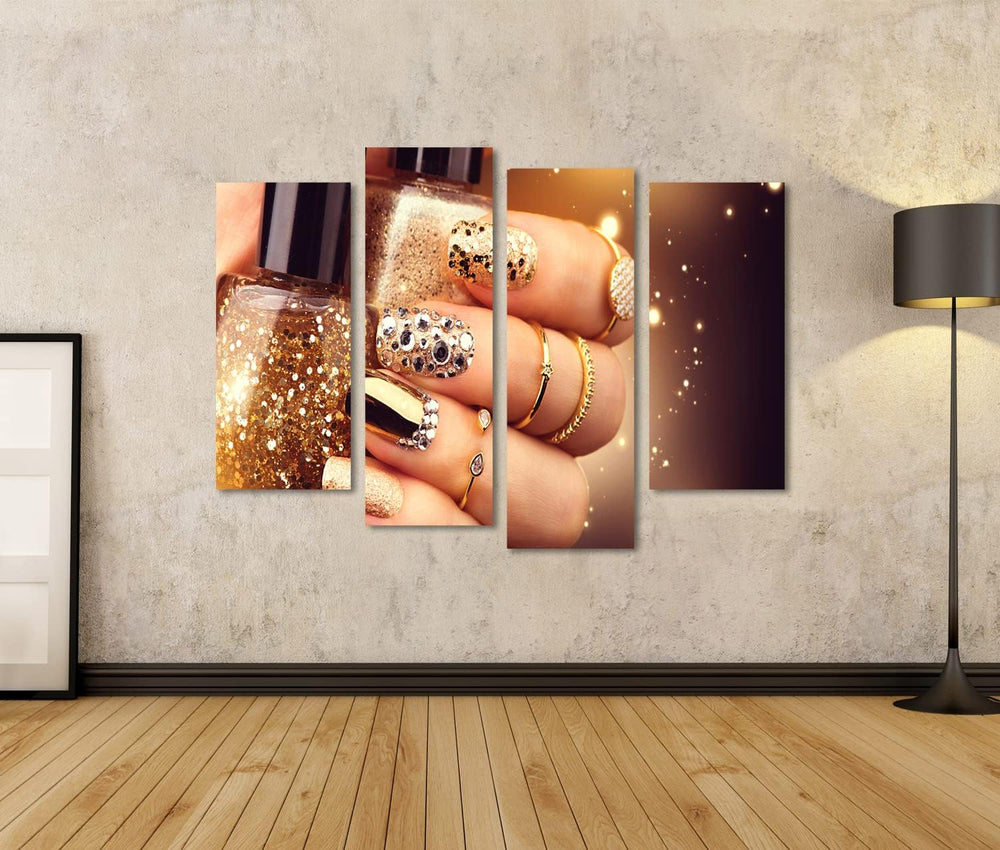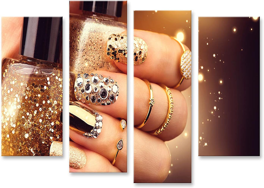 Bild auf Leinwand Goldene Maniküre Mit Edelsteinen Und Funkelt Eine Flasche Nagellack Trendige Acces