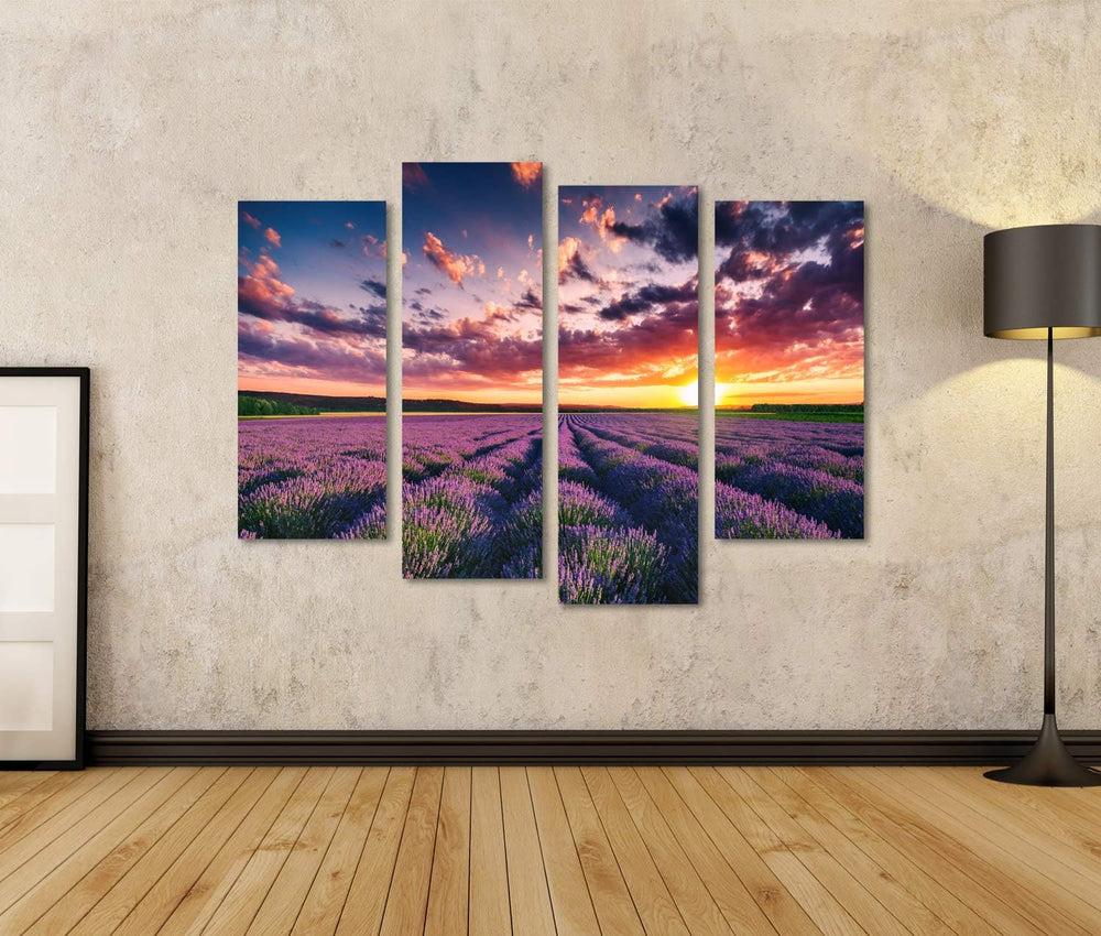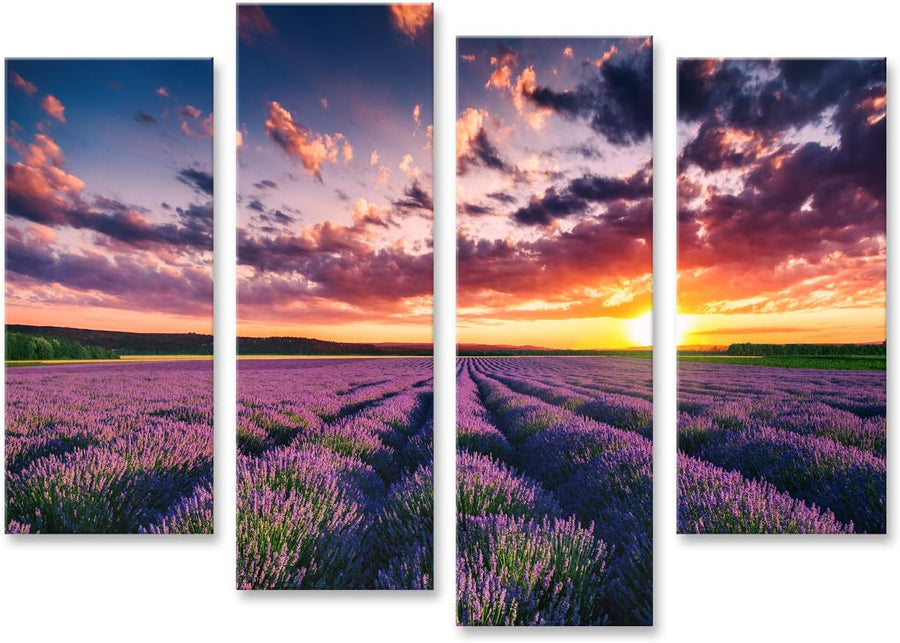 Bild auf Leinwand Lavendel Blumenfelder In Endlosen Reihen Blühen Sonnenuntergang Geschossen Wandbil