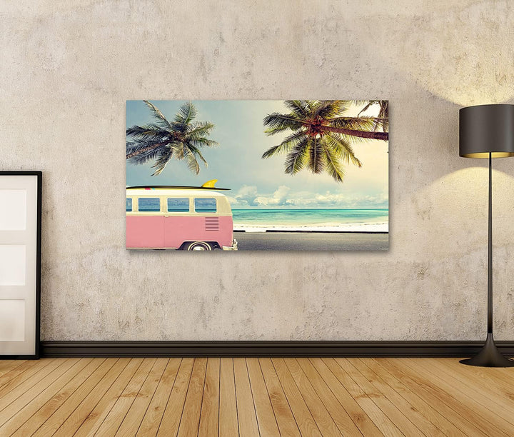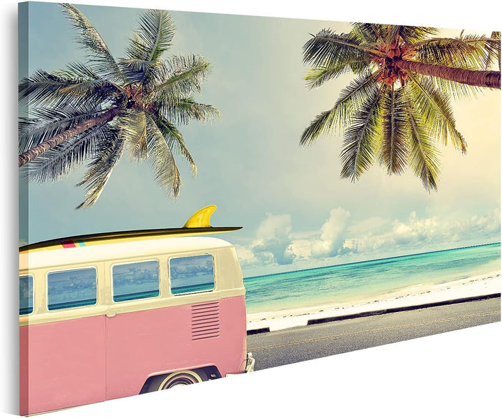 Bild auf Leinwand Oldtimer Strand Surfbrett Wandbild Poster Kunstdruck Bilder Format: 100x57cm, Form