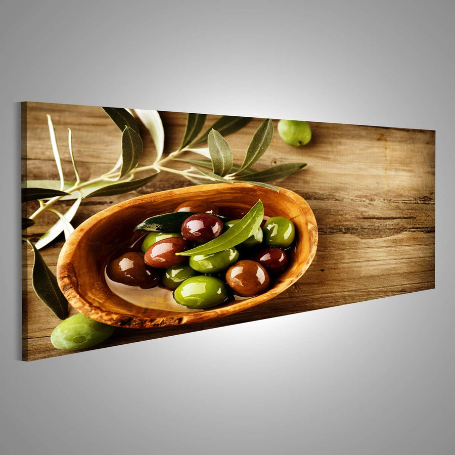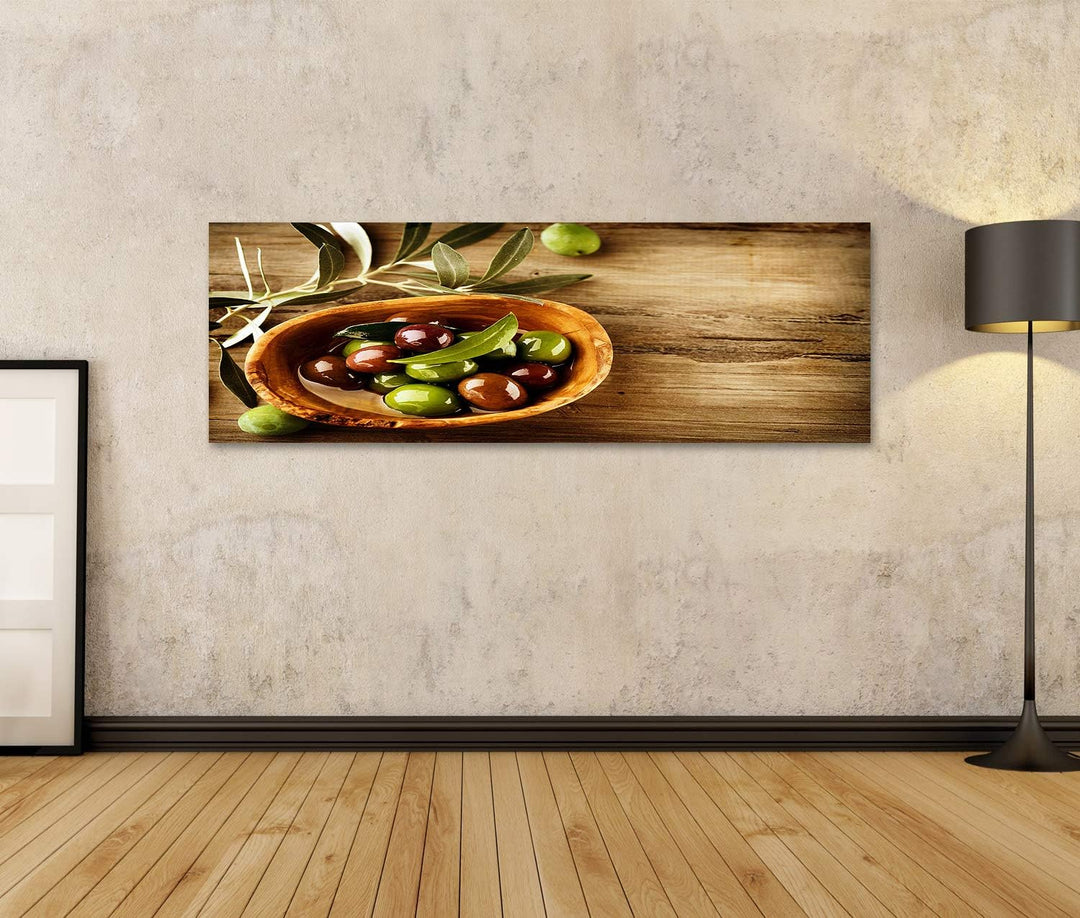 Bild auf Leinwand Oliven Olivenöl Küchenbild Wandbild Poster Kunstdruck Bilder Format: 120x40cm - Pa