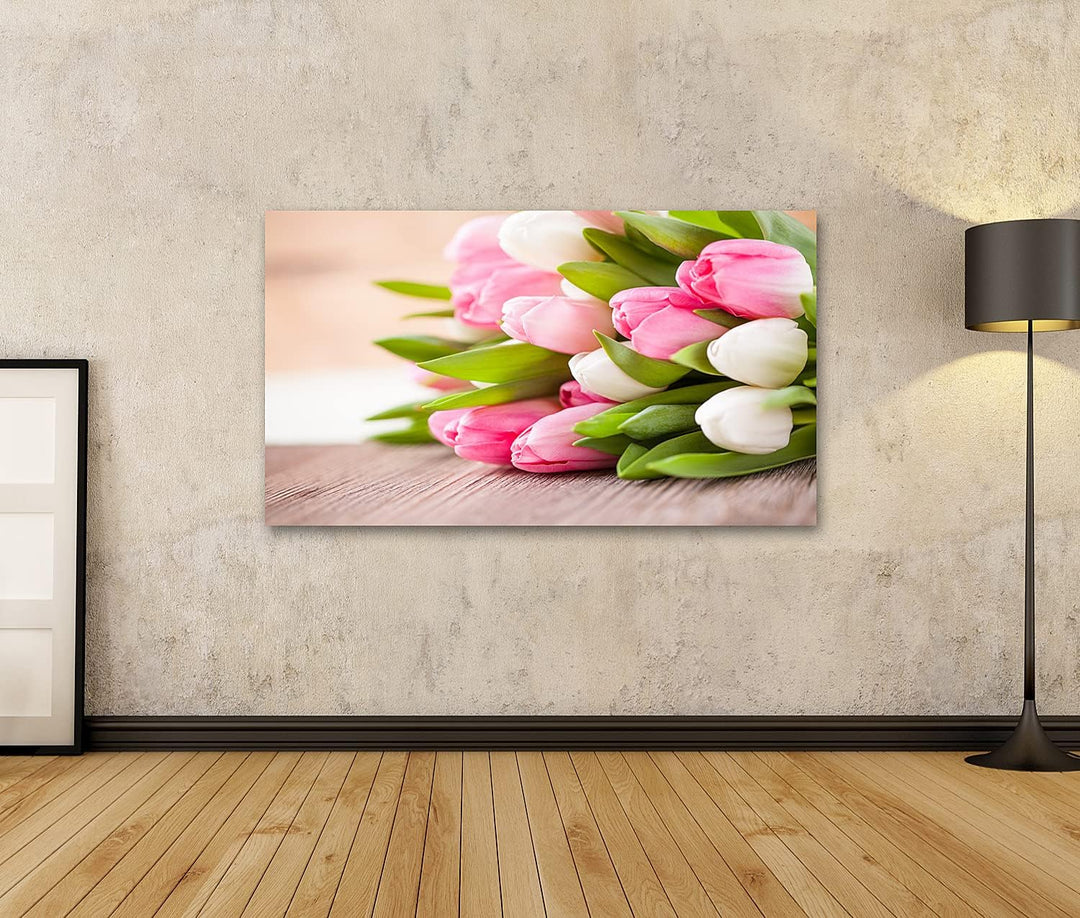Bild auf Leinwand Strauss Tulpen Vor Frühlingsszene Wandbild Poster Kunstdruck Bilder Format: 80x40c