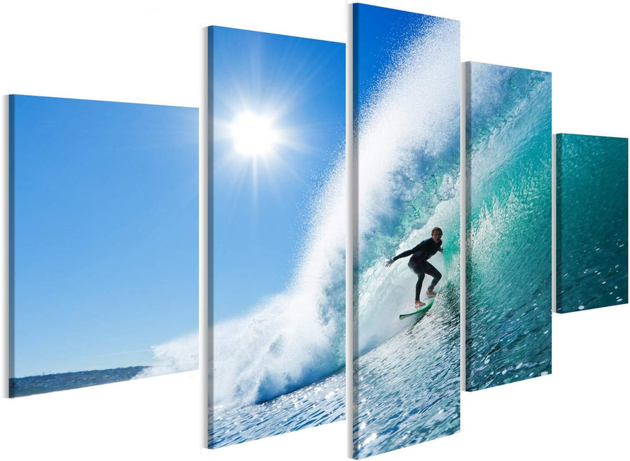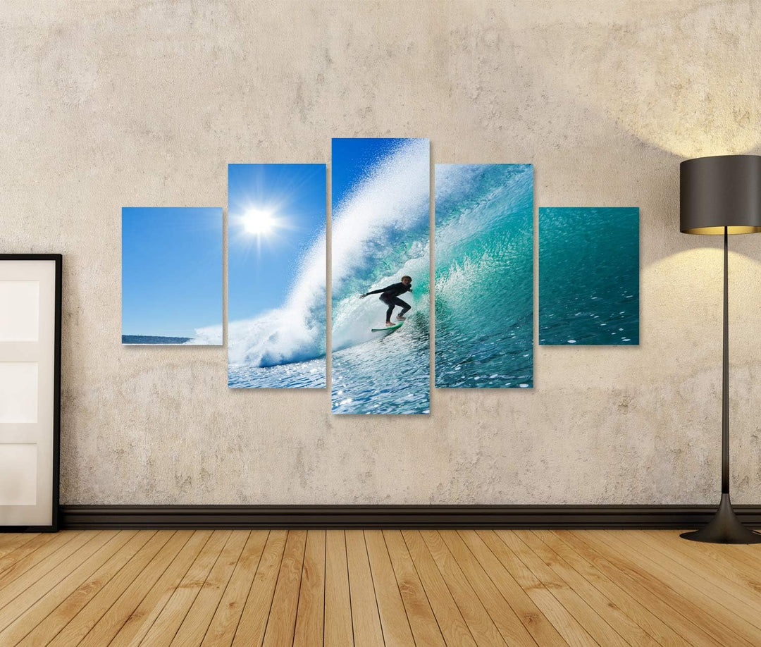 Bild auf Leinwand Surfer On Blue Ocean Wave Wandbild Poster Kunstdruck Bilder Format: 170x80cm - 5 T