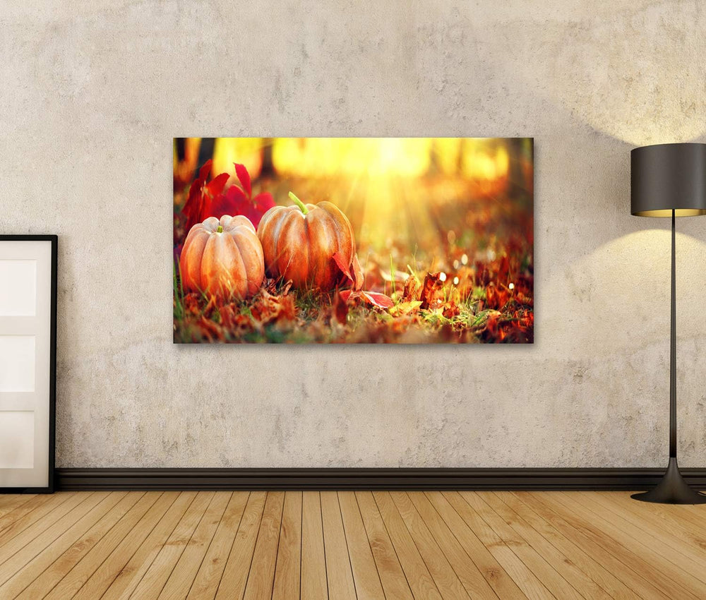 Bild Bilder auf Leinwand Herbst Halloween Kürbisse. Orange Kürbise über hellem herbstlichem Naturhin