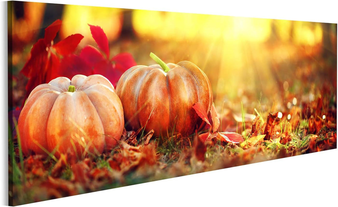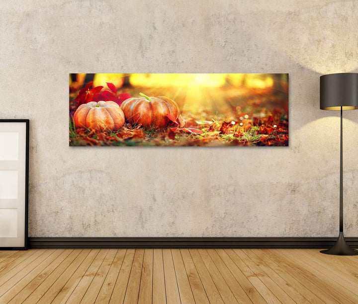 Bild Bilder auf Leinwand Herbst Halloween Kürbisse. Orange Kürbise über hellem herbstlichem Naturhin