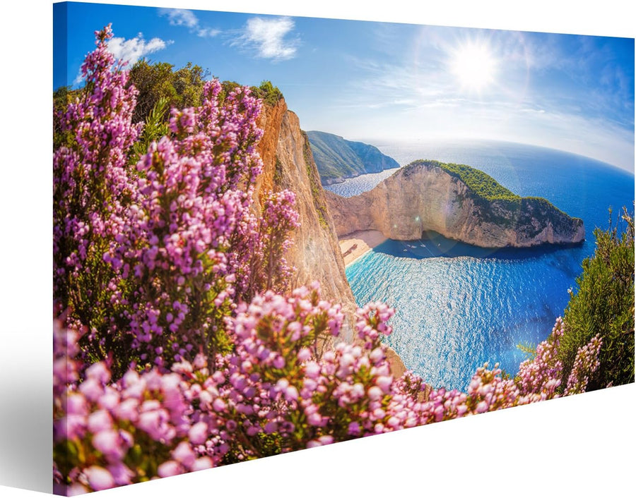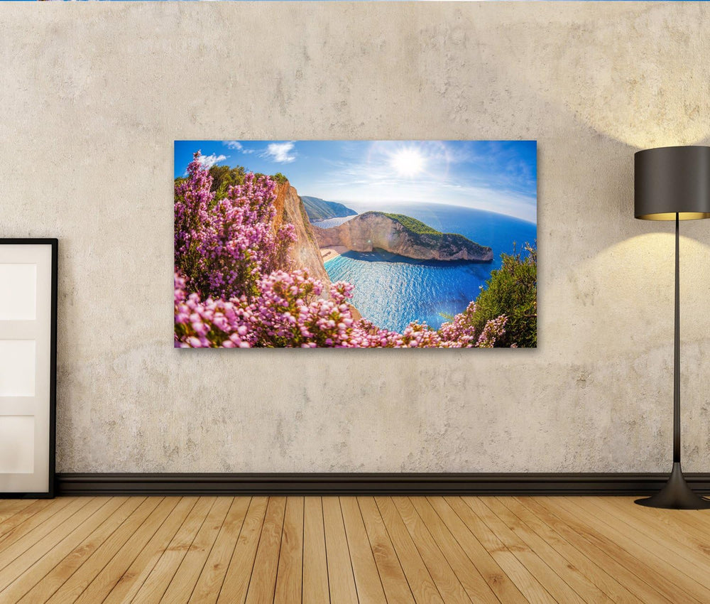 islandburner Bild Bilder auf Leinwand Navagio-Strand mit Schiffswrack und Blumen gegen Sonnenunterga