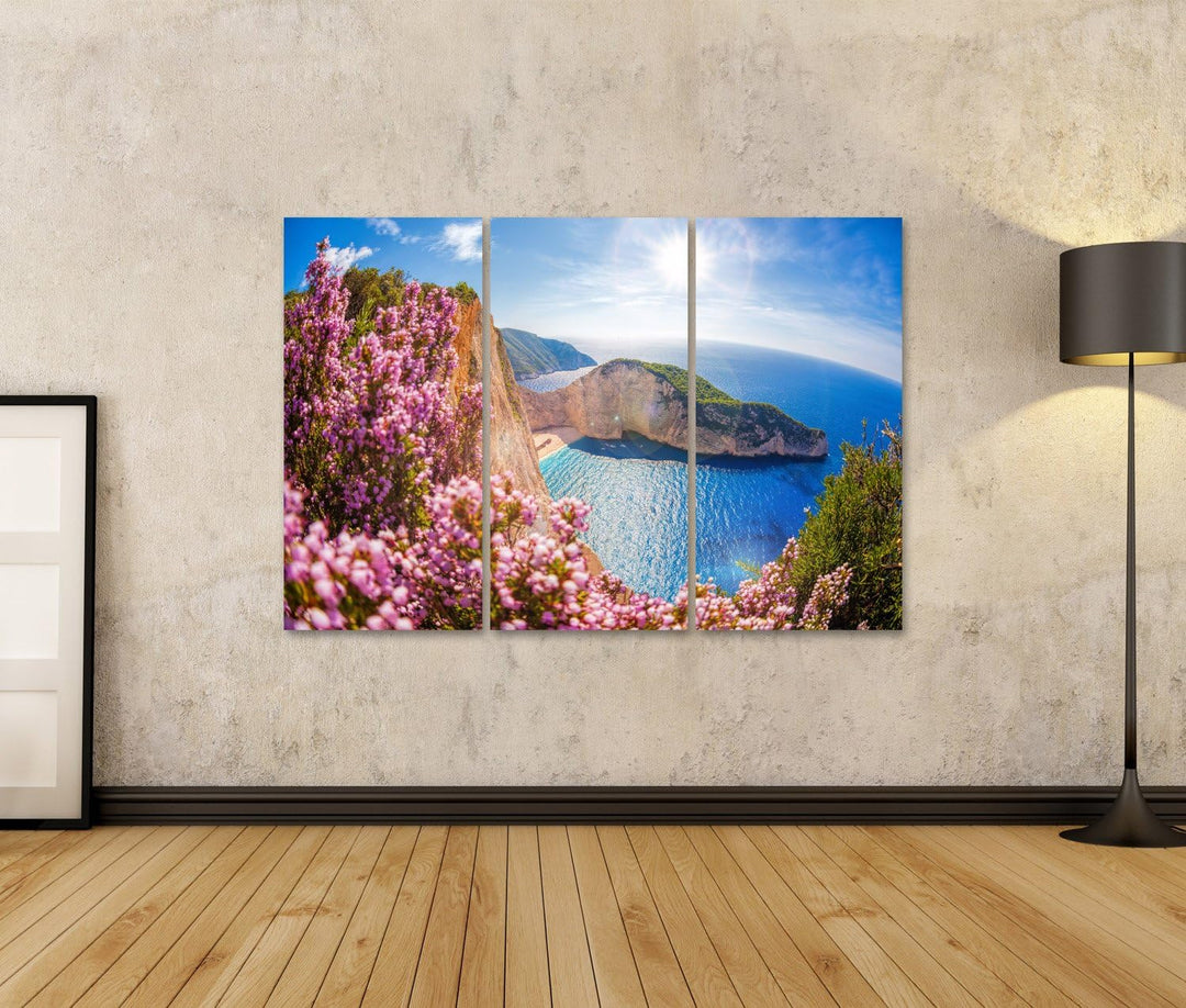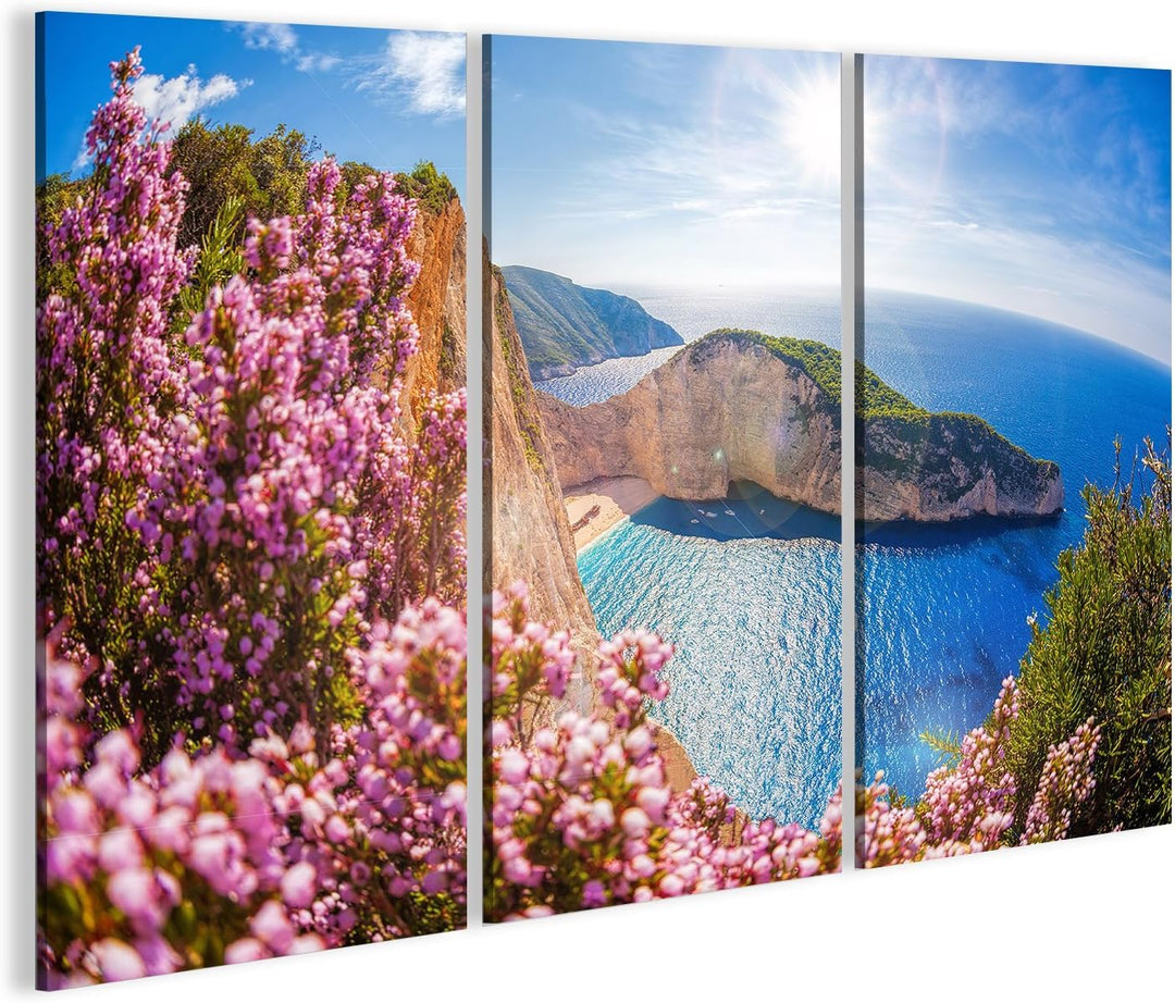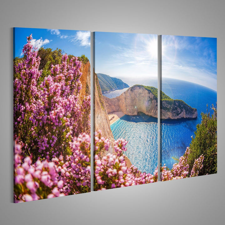 islandburner Bild Bilder auf Leinwand Navagio-Strand mit Schiffswrack und Blumen gegen Sonnenunterga
