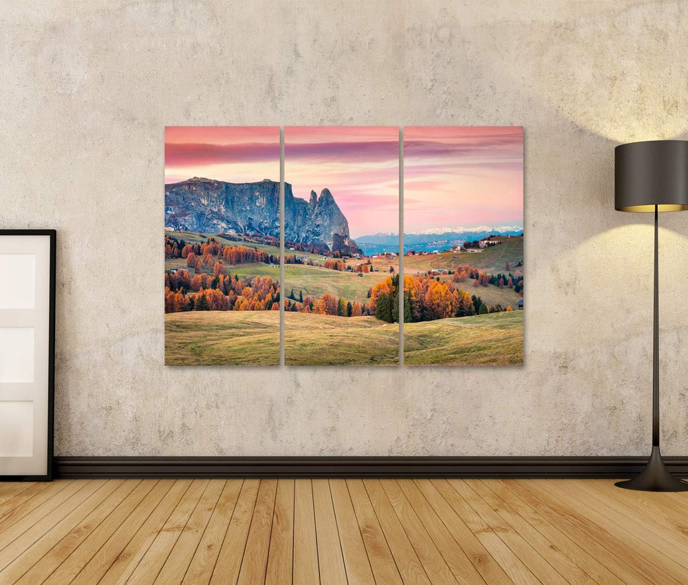 Bild Bilder auf Leinwand Unglaublicher Sonnenaufgang auf der Seiser ALM mit schönen gelben Lärchen u