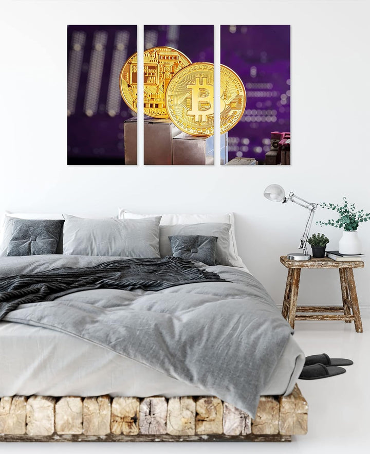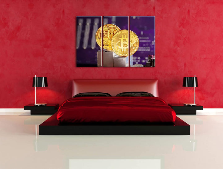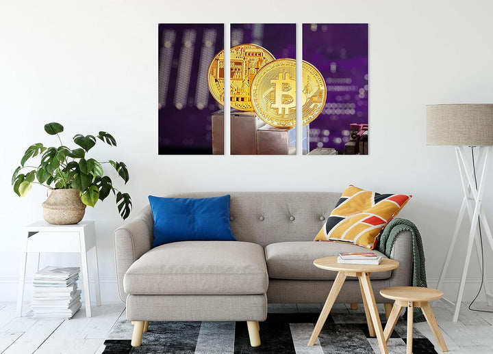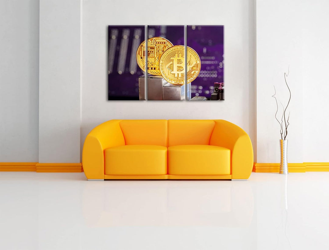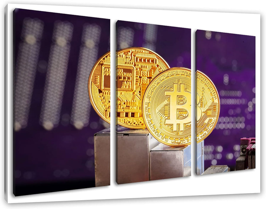 Bitcoin BTC auf Platineals Leinwandbild 3 teilig | Grösse: 120x80 cm | Wandbild | Kunstdruck | ferti