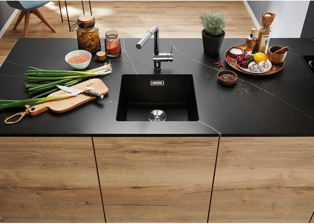 - Praktische Spüle in Schwarz: Wenn die Arbeitsplatte das Highlight ist, aber dennoch ein praktischer Arbeitsplatz benötigt wird, dann ist die Unterbauspüle aus Granit für 50 cm Unterschränke ideal