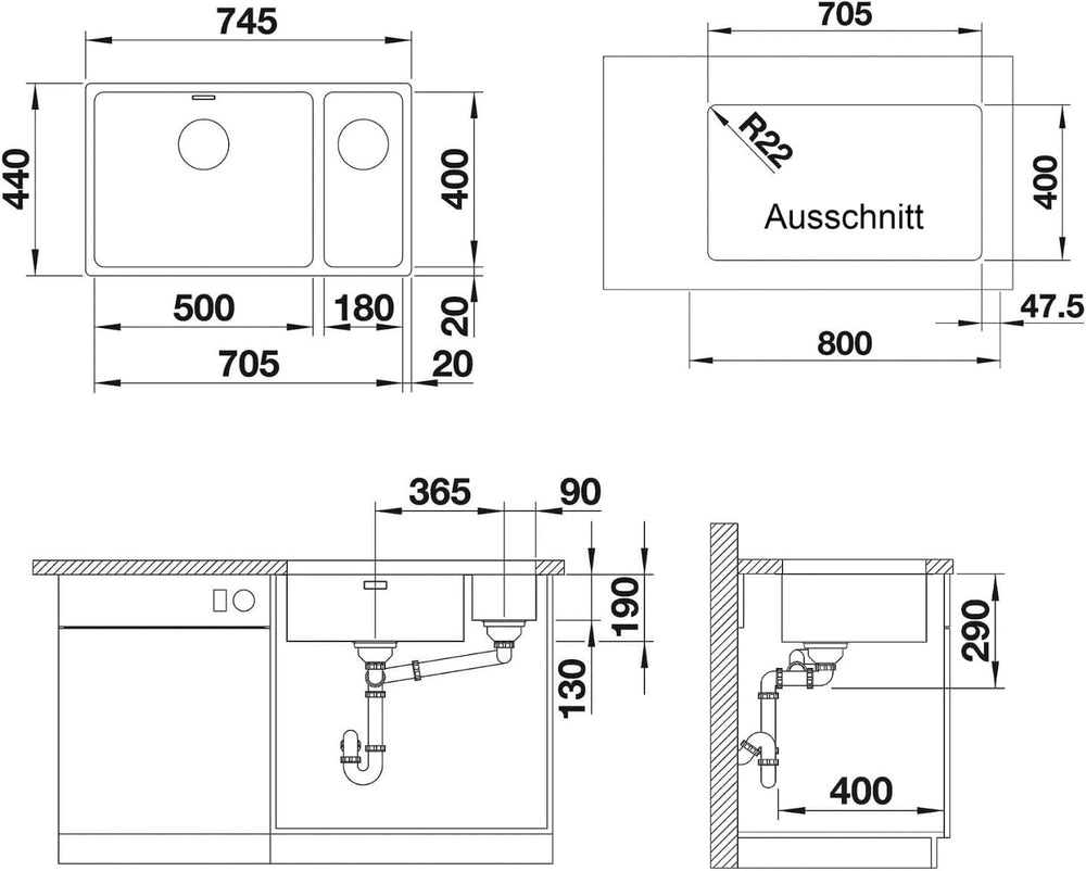 - Aussen-Abmessungen 745 x 440 mm / Beckentiefen 190 + 130 mm / Mindestbreite des Unterschranks: 80 cm - detaillierte Informationen zum Ausschnitt erhalten Sie auf der BLANCO Website