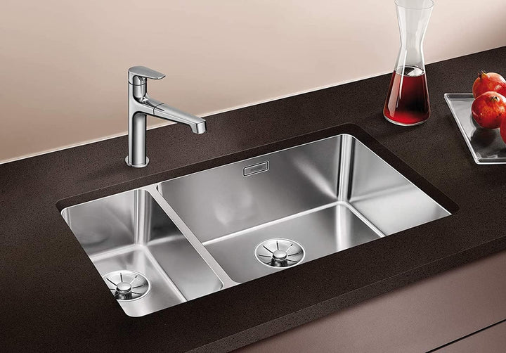 - Elegantes Doppelbecken in Premium-Qualität – aus hochwertigem Edelstahl, Seidenglanz-Finish – für den Unterbau