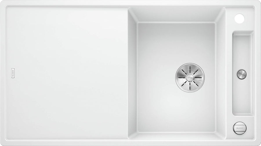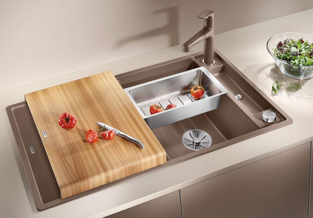 - Durchdacht bis ins Detail: mit verschiebbarem Schneidbrett, Ablaufsystem InFino, Ablauffernbedienung, elegant integriertem Überlauf und engen Radien für komfortable Nutzung