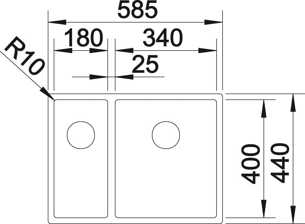 • Aussen-Abmessungen 585 x 440 mm / Beckentiefen 190 + 130 mm / Mindestbreite des Unterschranks: 60 cm - detaillierte Informationen zum Ausschnitt erhalten Sie auf der BLANCO Website