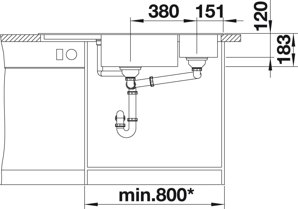 • Für Eck-Unterschränke - 90 x 90 cm / bei Zeileneinbau: Unterschrankbreite 80 cm –Arbeitsplattentiefe mind. 65 cm - Aussen-Abmessungen 1042 x 560 mm / Beckentiefen 183 + 120 mm