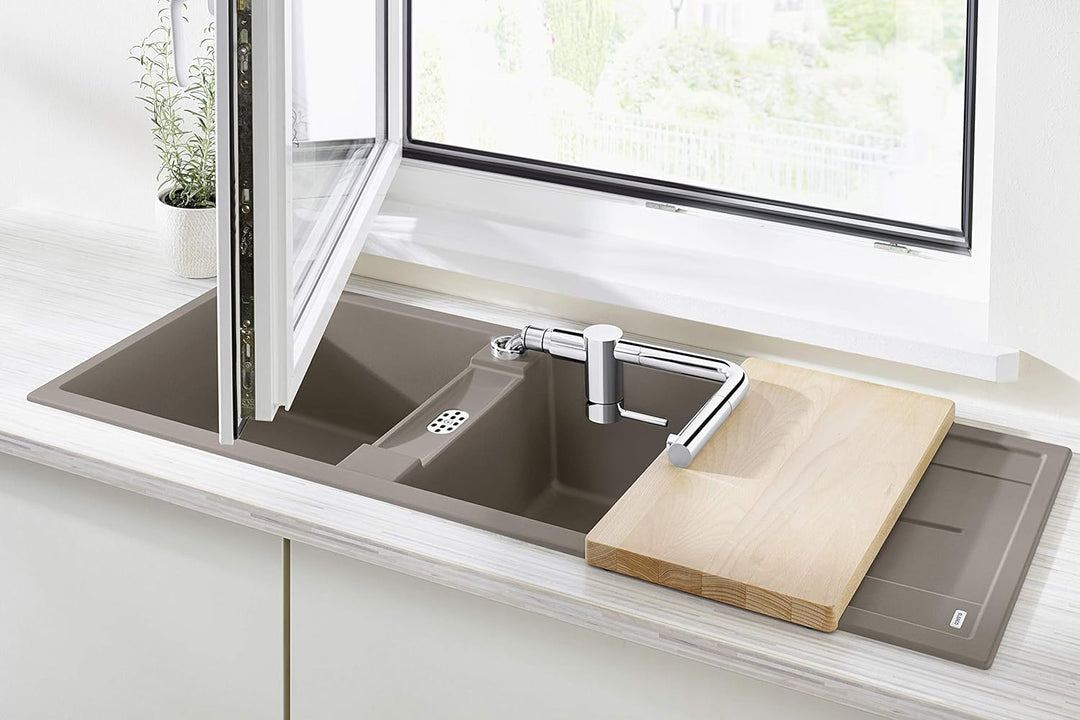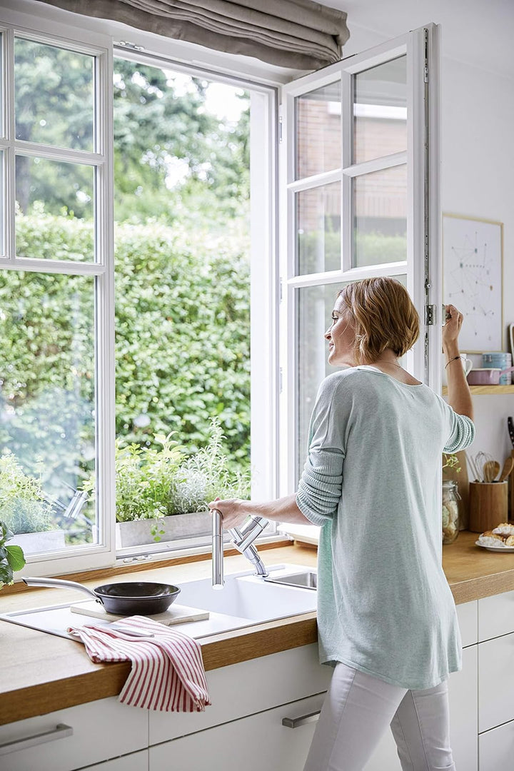 - Speziell für die Montage vor dem Fenster: abnehmbarer Einhebelmischer (Hochdruckausführung) in minimalistischem Design