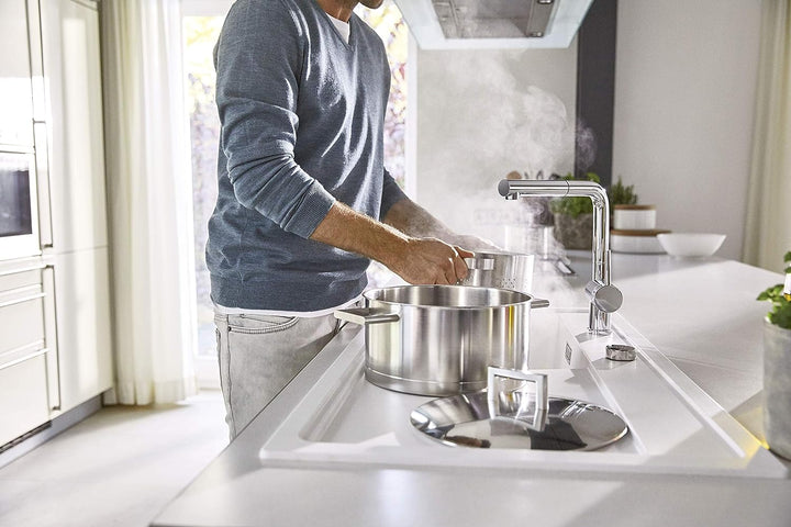 • Grosszügiger Aktionsradius auch ausserhalb der Spüle: Ausziehbarer Auslauf für vereinfachtes Befüllen schwerer Töpfe und leichtes Reinigen grosser Spülen