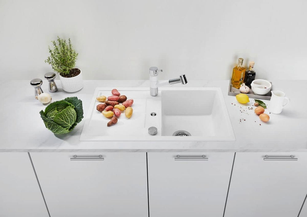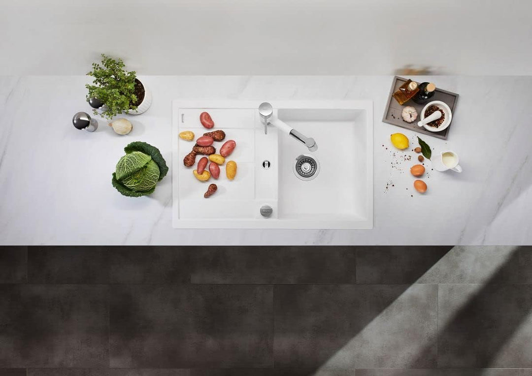 - Einbauspüle in weiss: Mit verkürzter Abtropffläche für 45 cm breite Unterschränke – in weiteren SILGRANIT-Farben erhältlich und farblich auf die passenden BLANCO Armaturen abstimmbar