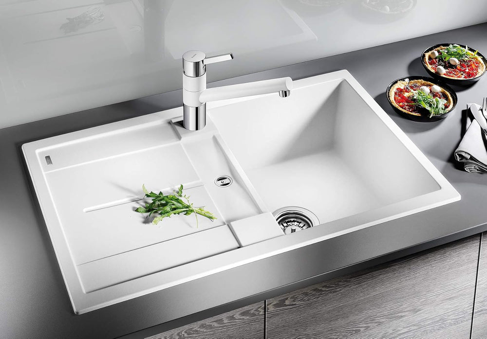 • Einbauspüle in weiss: Mit integrierter Abtropffläche für 45 cm breite Unterschränke – in weiteren SILGRANIT-Farben erhältlich und farblich auf die passenden BLANCO Armaturen abstimmbar