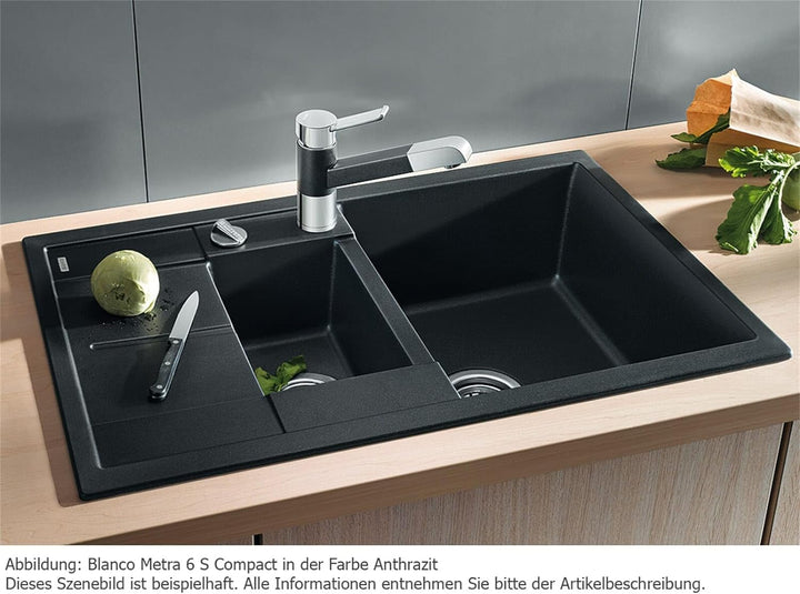 - Einbauspüle in Anthrazit: Mit verkürzter Abtropffläche für 60 cm breite Unterschränke – in weiteren SILGRANIT-Farben erhältlich und farblich auf die passenden BLANCO Armaturen abstimmbar