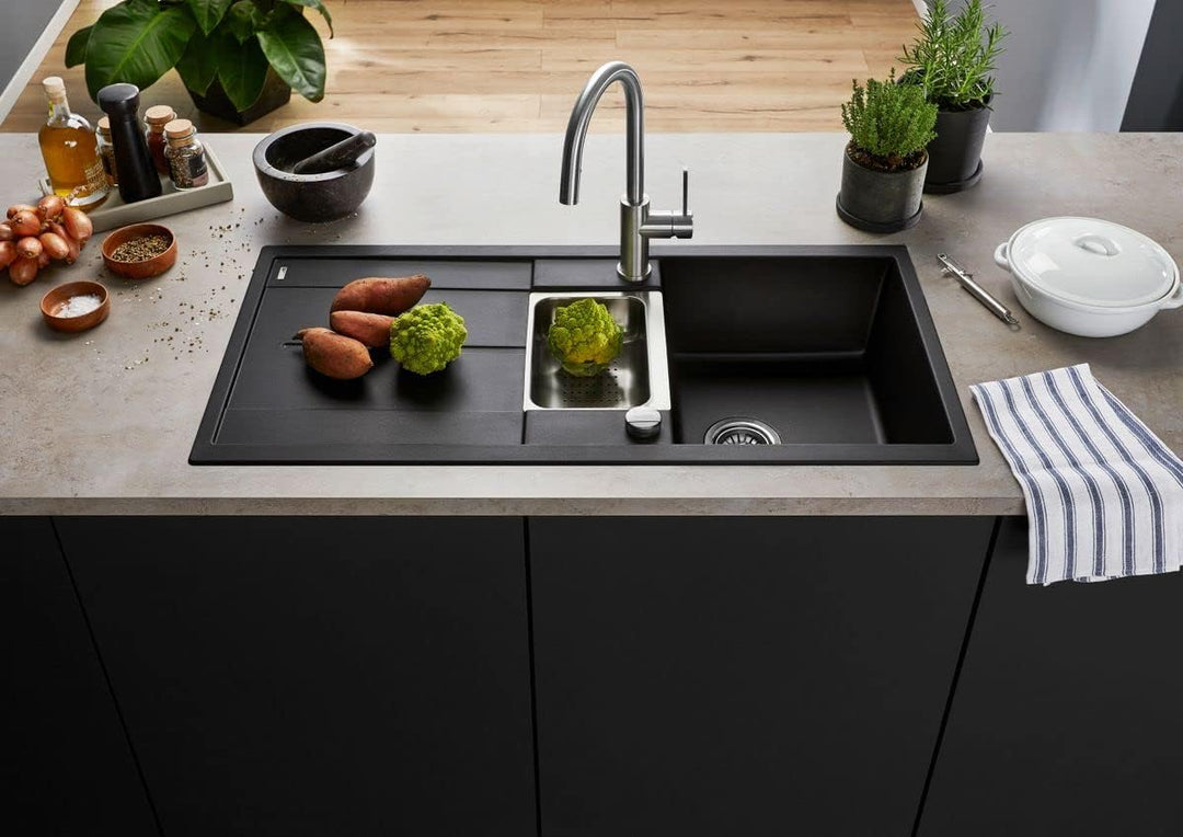 - Einbauspüle in Anthrazit: Mit Zusatzbecken inklusive Edelstahlschale für 60 cm breite Unterschränke – in weiteren SILGRANIT-Farben erhältlich und farblich auf die passenden BLANCO Armaturen abstimmbar