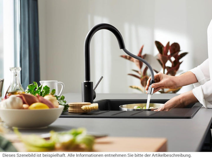 • Akzente setzen: Mit dem dezenten Einhandmischer in Silgranitschwarz mit hohem, gebogenen Auslauf – auch für Colour Matching mit farbigen SILGRANIT Spülen
