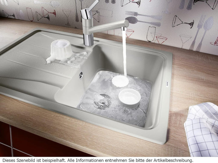 - Lieferumfang: Spüle, Ablaufgarnitur mit Raumsparrohr, 3 1/2 Korbventil, Befestigungsset für Holzarbeitsplatten mit 28 mm Stärke und mehr