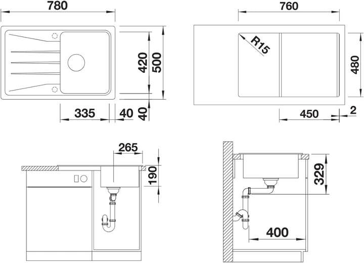 - für 45 cm breite Unterschränke - Aussen-Abmessungen 780 x 500 mm / Beckentiefe 190 mm / Ausschnitt 760 x 480 mm