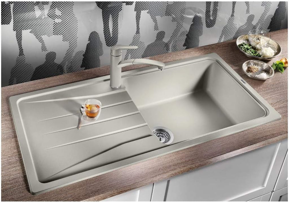 - Lieferumfang: Spüle, Ablaufgarnitur mit Raumsparrohr, 3 1/2 Korbventil, Befestigungsset für Holzarbeitsplatten mit 28 mm Stärke und mehr
