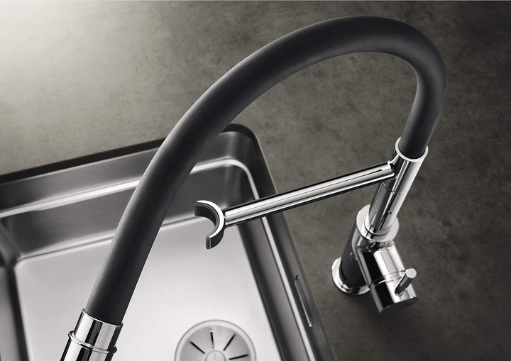 - Großzügiger Aktionsradius durch den Rund-um-Schwenkbereich (360°) und flexiblen Auslauf – dank der Magnethalterung kann die flexible Schlauchbrause leicht entnommen und wieder arretiert werden