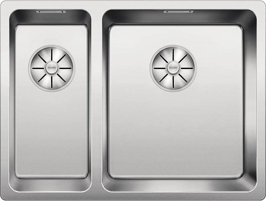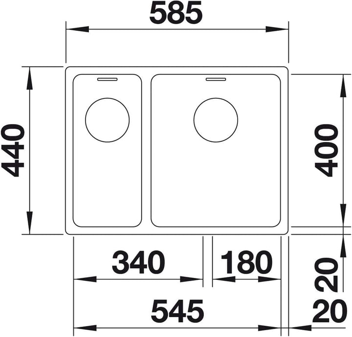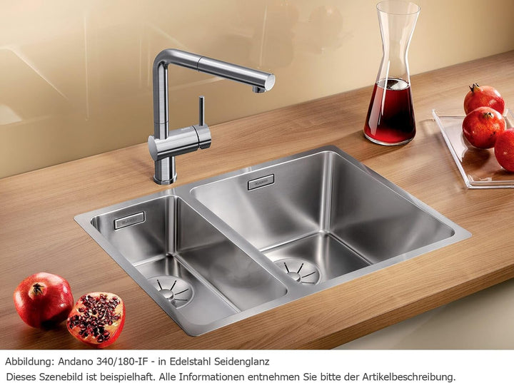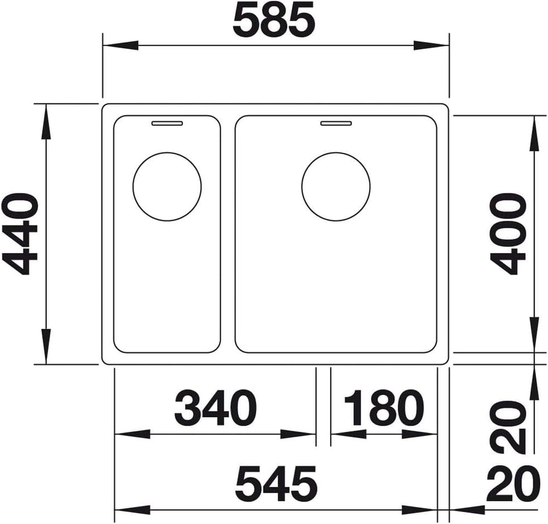 - Aussen-Abmessungen 585 x 440 mm / Beckentiefen 190 + 130 mm / Mindestbreite des Unterschranks: 60 cm - detaillierte Informationen zum Ausschnitt erhalten Sie auf der BLANCO Website