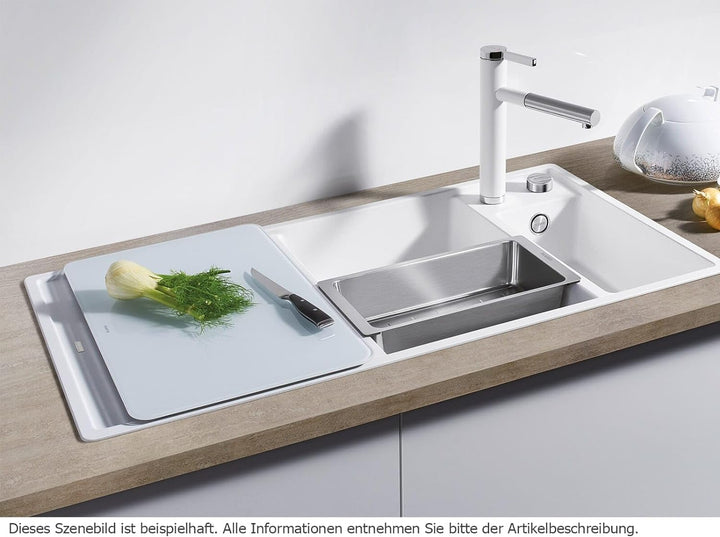 • Mit geräumigem Spülbecken, kompakter glatter Abtropffläche, seitlichem Zusatzbecken und verschiebbarem Schneidbrett